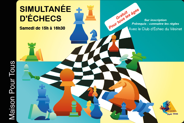 Simultanée d'échecs Pour information et inscription, contactez la Maison pour Tous au 01.39.73.48.22 ou rdv sur le site internet de la Bibliothèque MPT Simultanée d'échecs De 4 à 99 ans Détails des prochaines sessions Le samedi 11 octobre 2025 de 15:00 à 16:30 Public Tout Public Lieu Bibliothèque Maison pour Tous Le samedi 22 novembre 2025 de 15:00 à 16:30 Public Tout Public Lieu Bibliothèque Maison pour Tous Le samedi 20 décembre 2025 de 15:00 à 16:30 Public Tout Public Lieu Bibliothèque Maison pour Tous Prochaines sessions